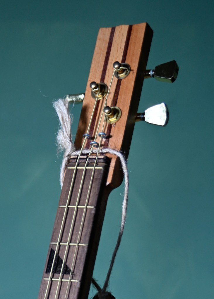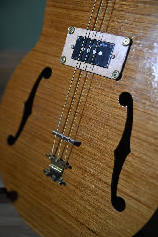 3 string laminated body featuring laminated neck, single pickup and floating (adjustable) bridge, f hole design, engraved position markers and brass frets.£320 (inc P&P within UK)
