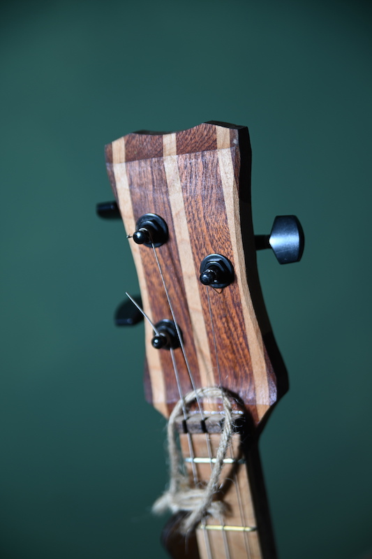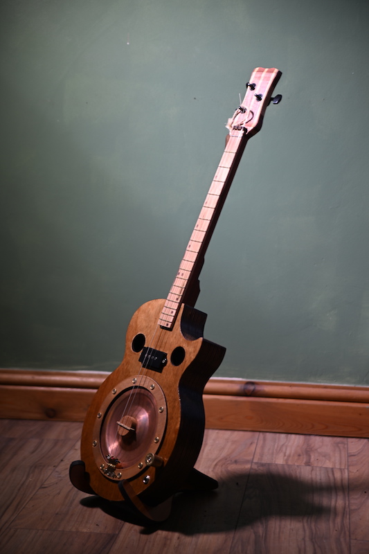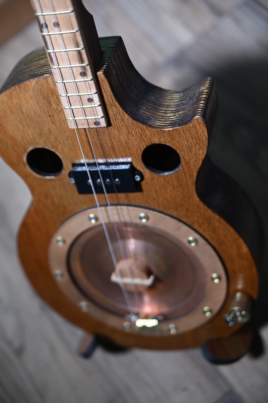 3 string laminated wood body, featuring laminated neck, single pickup and adjustable bridge, copper resonator cone, engraved position markers and brass frets. £320 (inc P&P within UK)