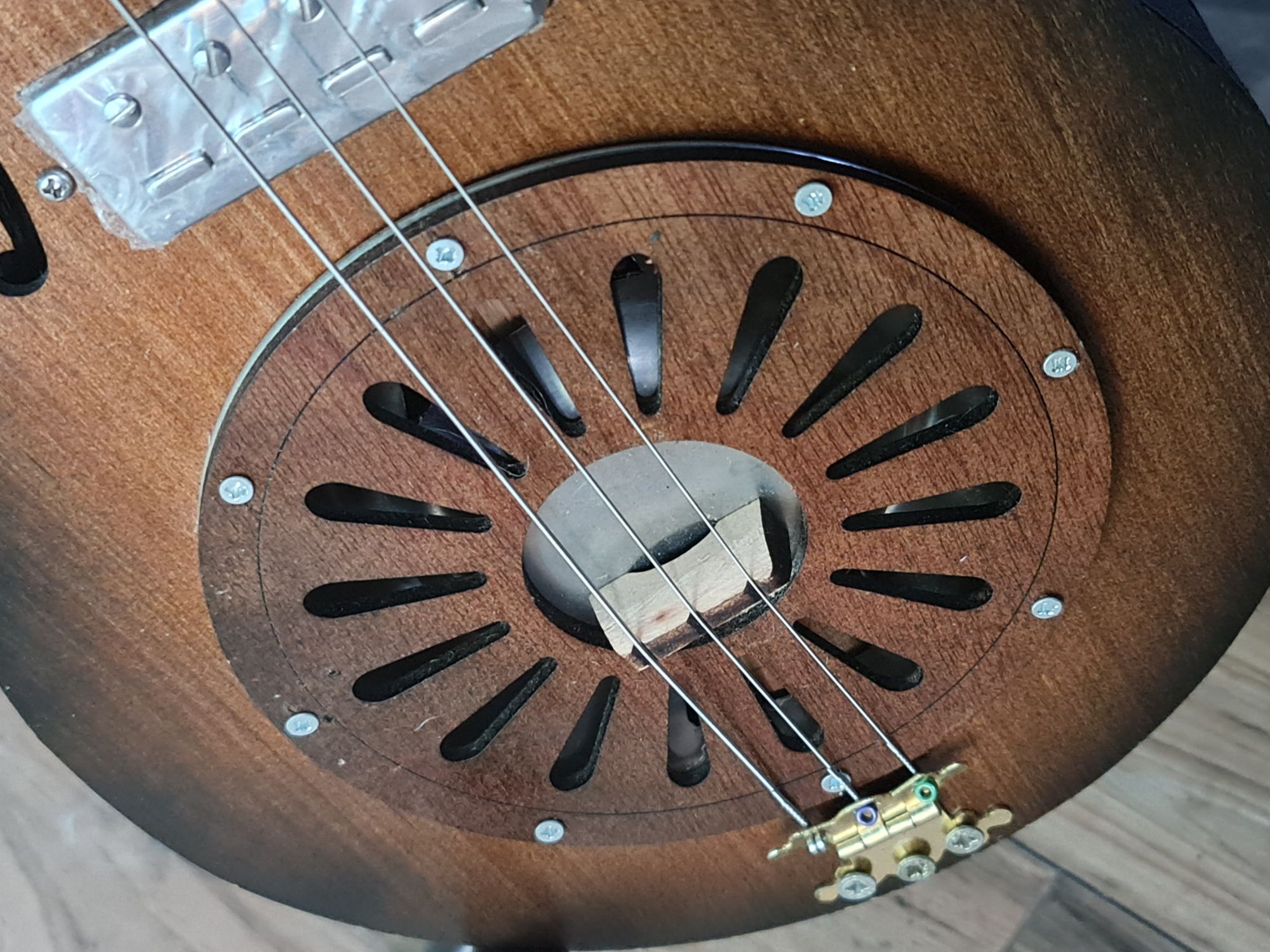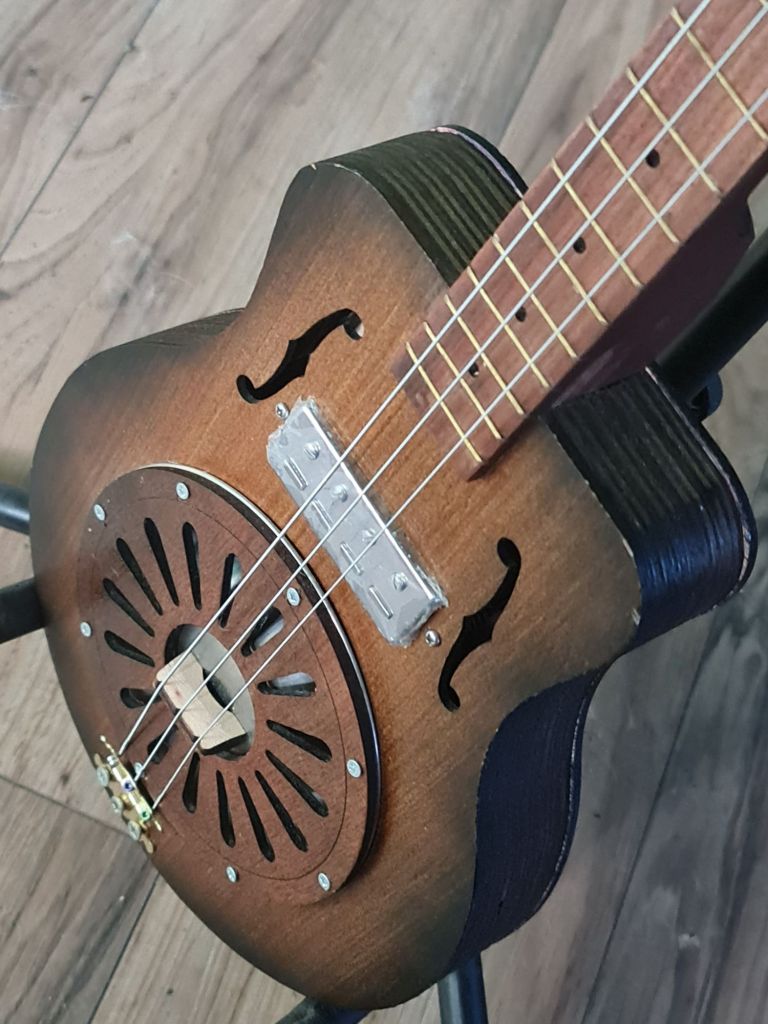 3 string laminated wood body, featuring laminated neck, single pickup and adjustable bridge, engraved position markers and steel frets . £360 (inc P&P within UK)