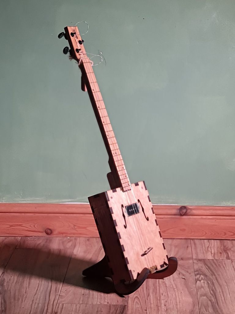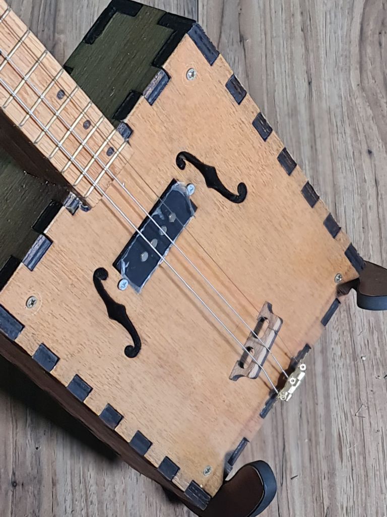 3 string body featuring laminated neck, single pickup and floating (adjustable) bridge, f hole design, engraved position markers and brass frets.£270 (inc P&P within UK)