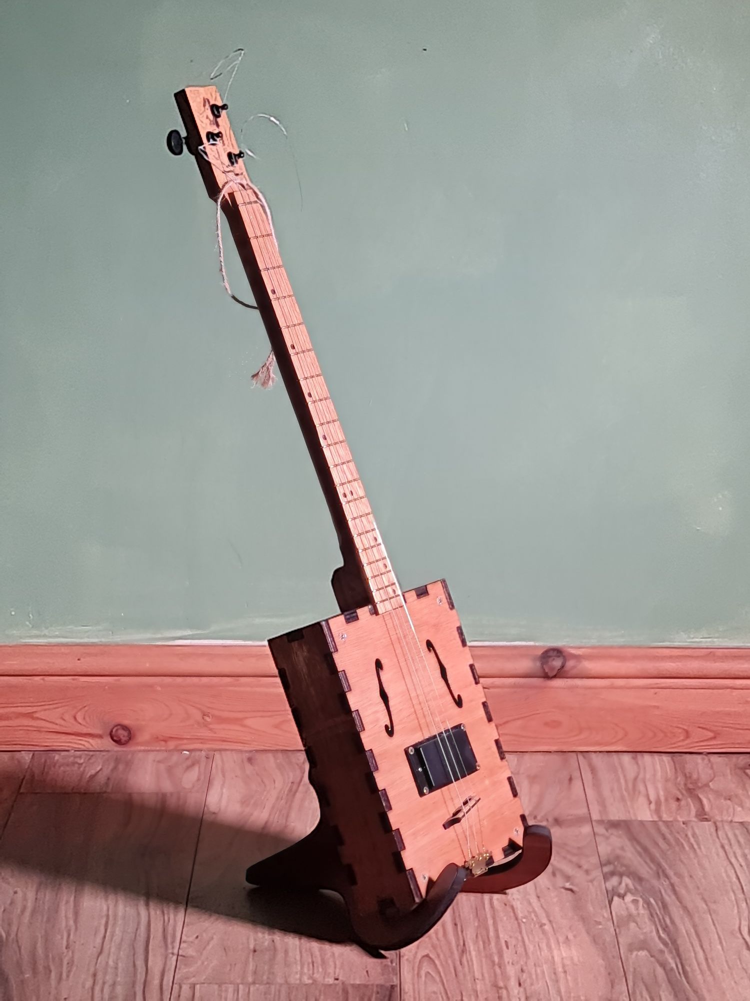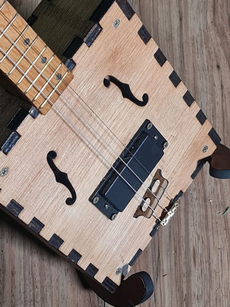 3 string body featuring laminated neck, single pickup and floating (adjustable) bridge, f hole design, engraved position markers and brass frets.£270 (inc P&P within UK)