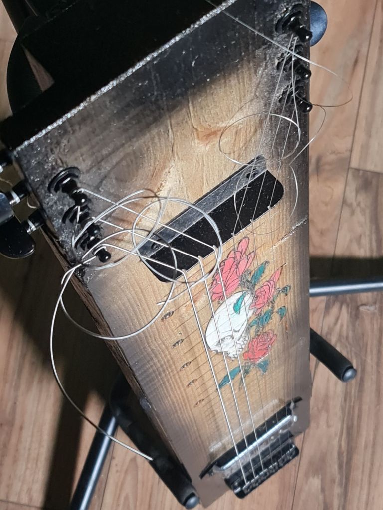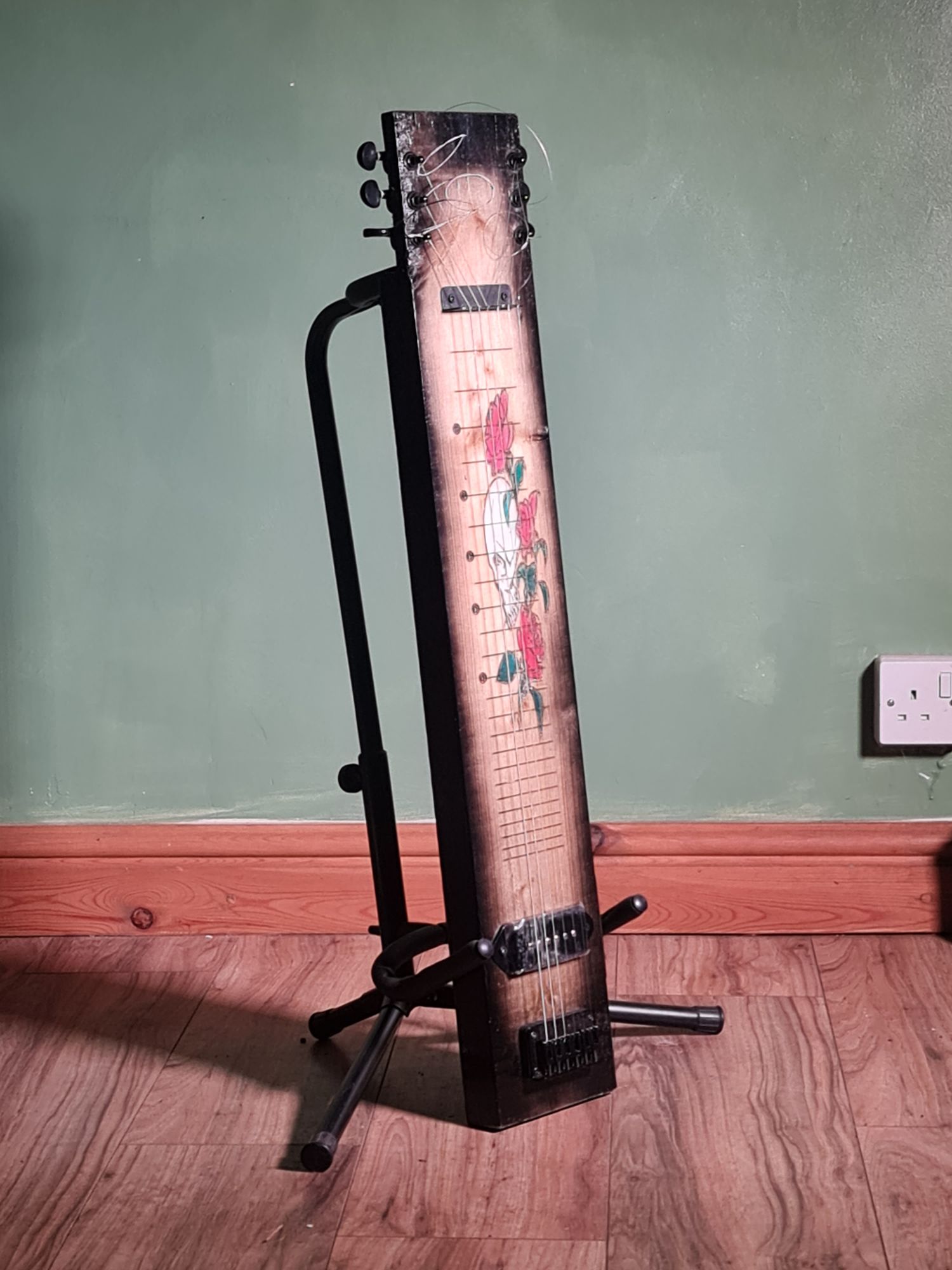 6 string Lap Steel, featuring engraved & painted skull design with fret markers. P90 style pickup and adjustable bridge.