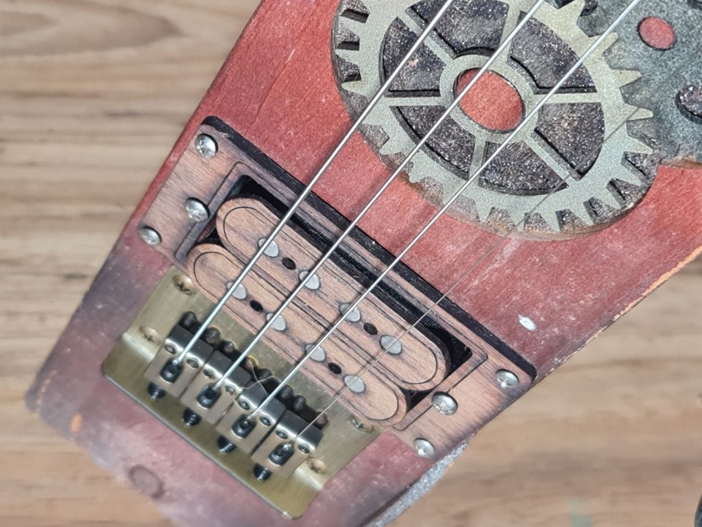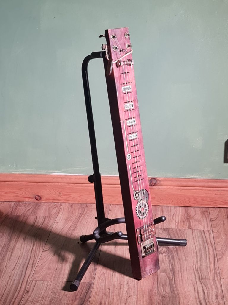 4 string Lap Steel, featuring SteamPunk style neck with fret markers and inlayed details. Humbucker style pickup and adjustable bridge.
