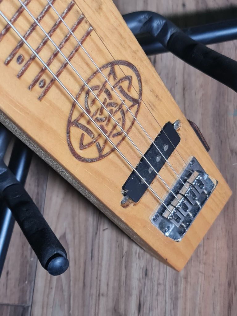 4 string Lap Steel, featuring engraved style neck with fret markers and inlayed details. Single coil style pickup and adjustable bridge.