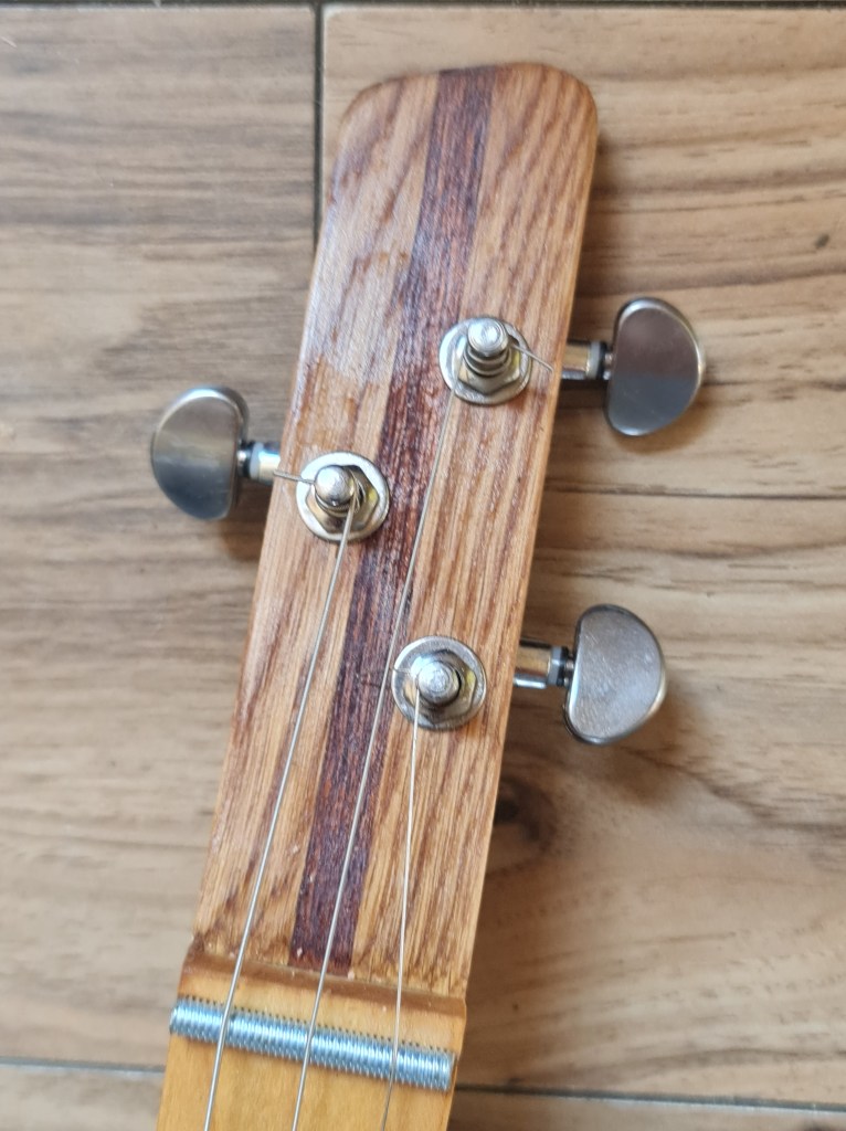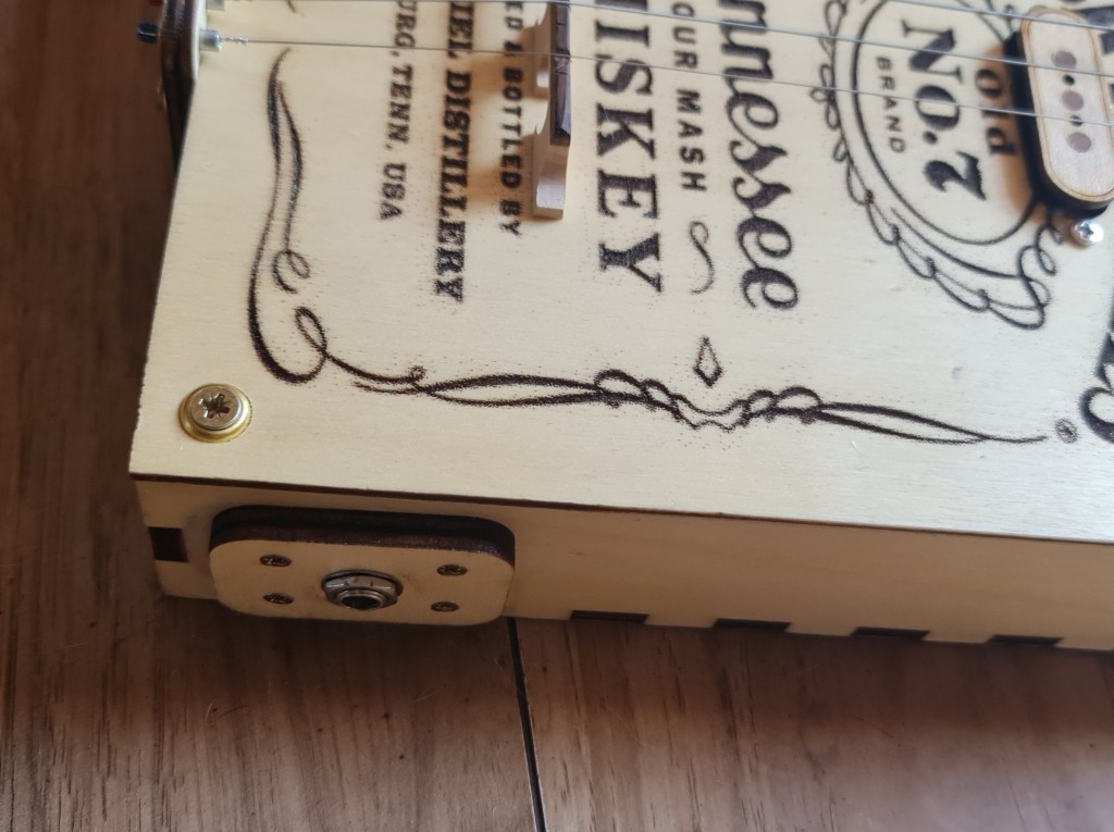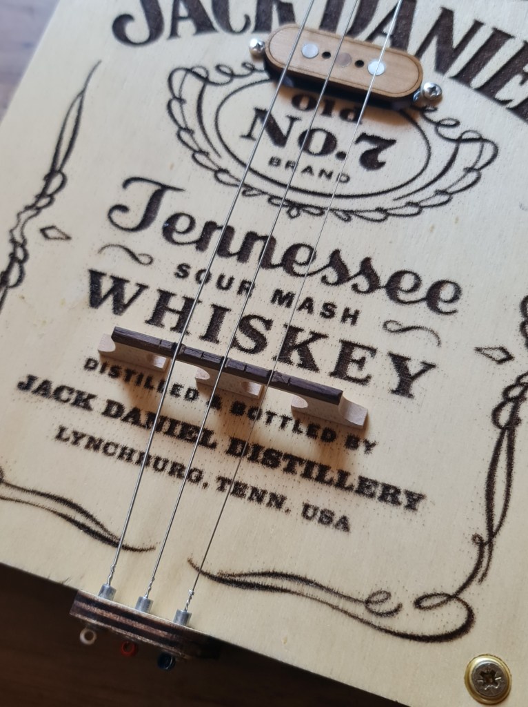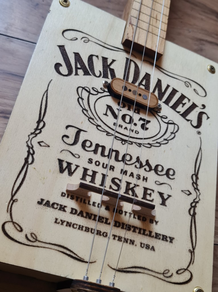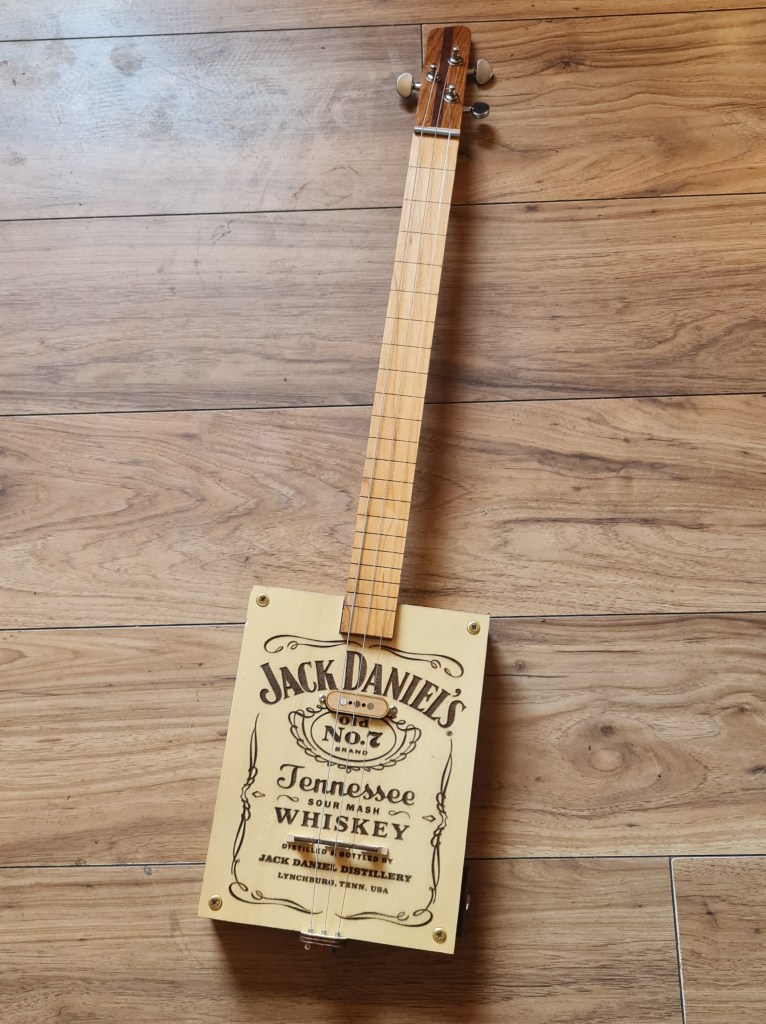 3 string slide (fretless) guitar – with Jack Daniels engraved body, laminated neck tuned to GDG, single coil electric pickup, bold nut, hardwood bridge and chrome tuners.