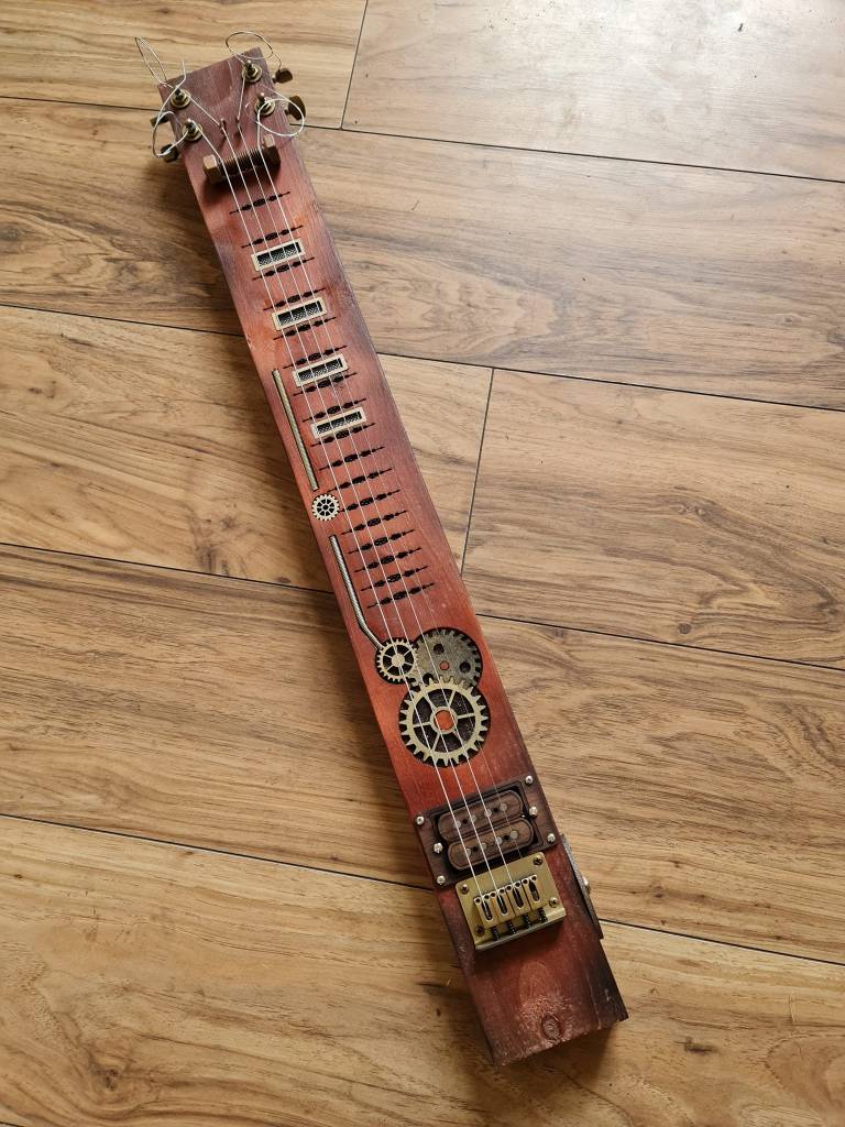 4 string fretless lapsteel guitar – Unique inlayed cog / gear designs with an adjustable 4 string vintage style bridge, steel bolt nut, vintage style tuners and matching wood style pickup.
