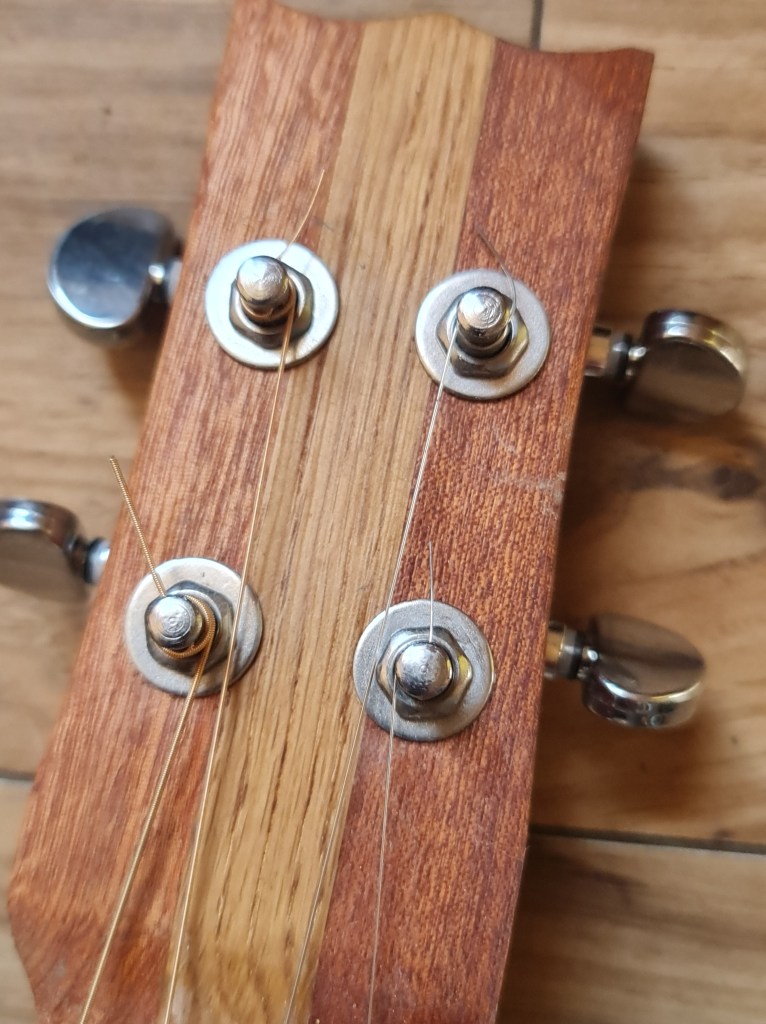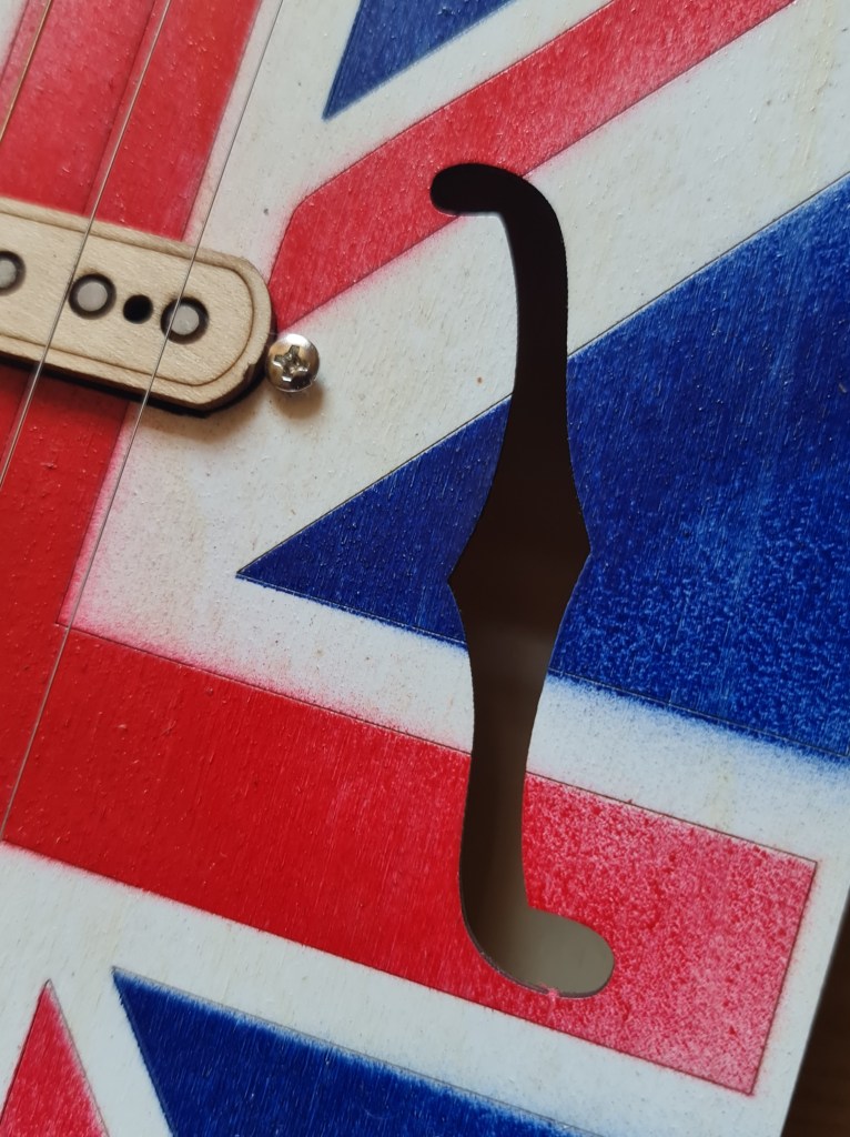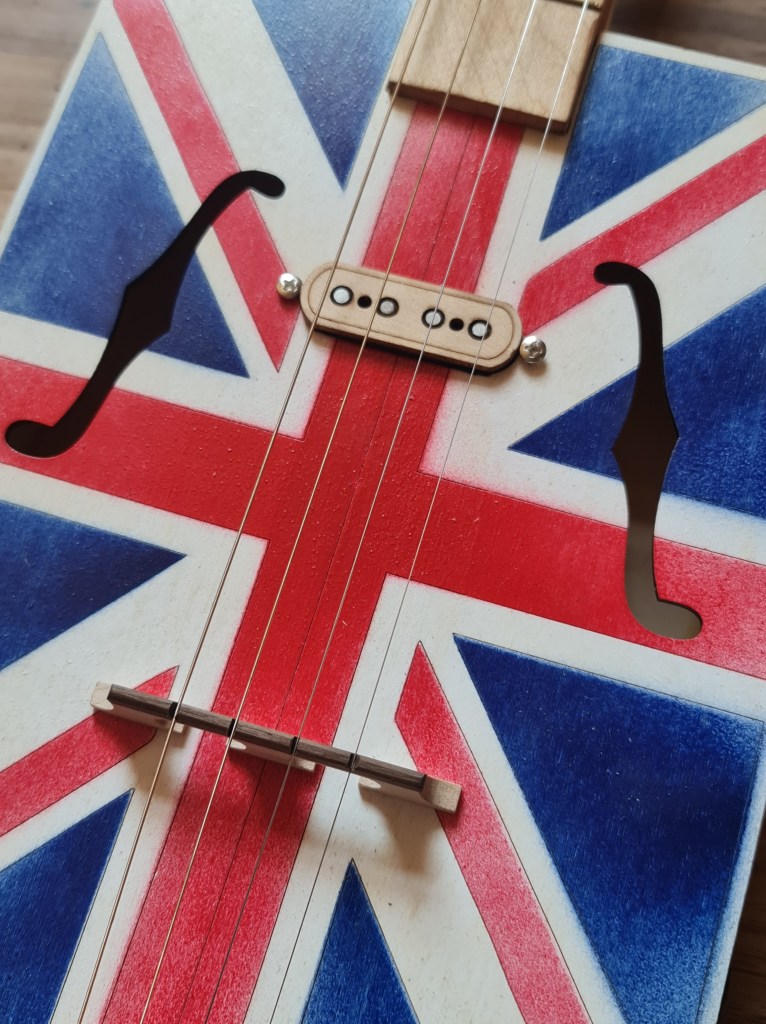 4 string slide (fretted) guitar – with Union Jack painted body, laminated neck tuned to DGBE, single coil electric pickup, bone nut, hardwood bridge and chrome tuners.